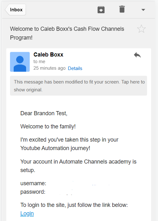 Check your spam and promotion inbox for an email with the subject "Welcome to Caleb Boxx's Cash Flow Channels Program!"